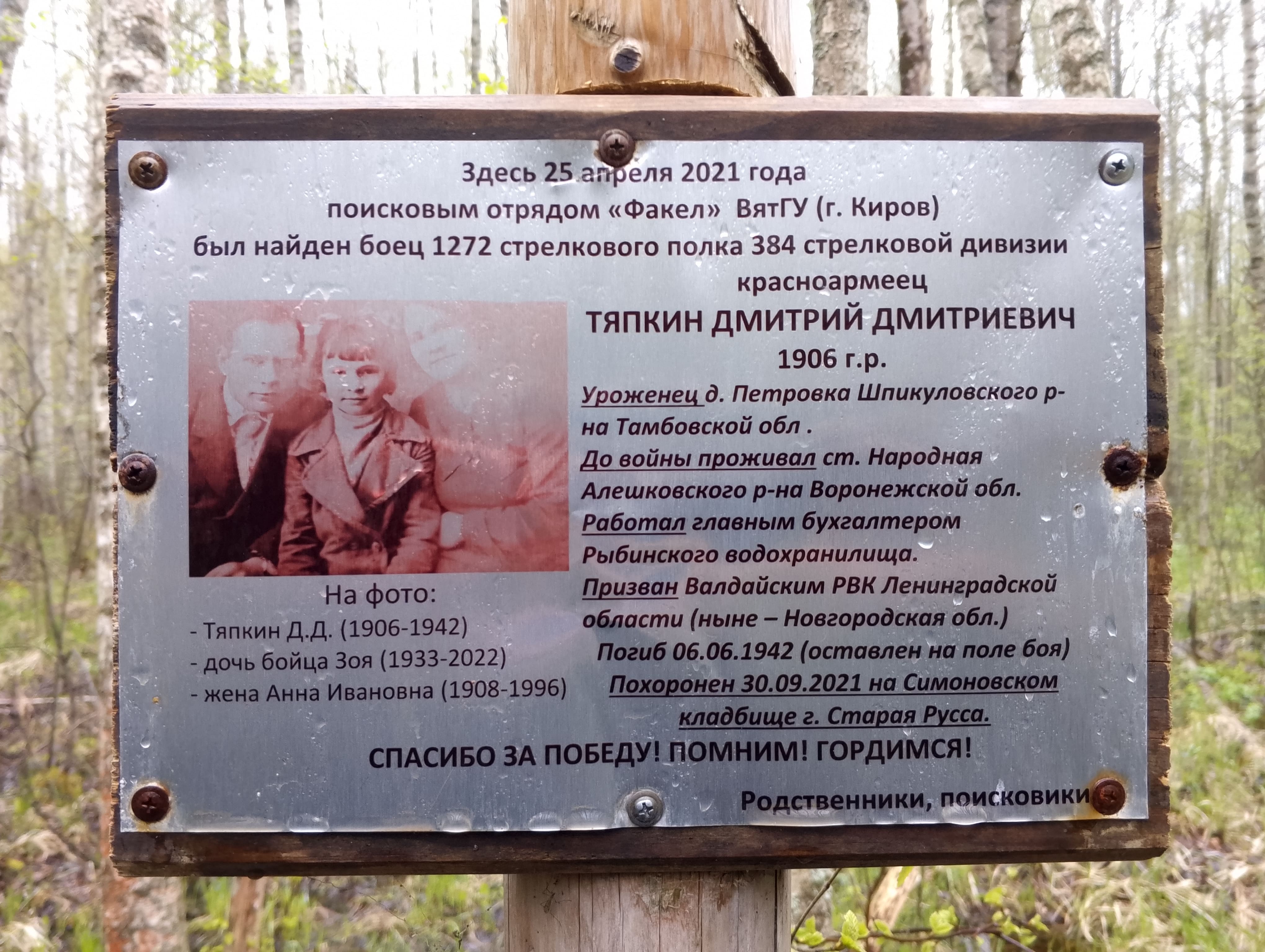 Благодаря активной 25-летней поисковой работе отряда студентами-поисковиками и выпускниками ВятГУ из отряда «Факел» найдены и захоронены с отданием воинских почестей останки 750 бойцов и командиров Красной Армии. Установлены имена 38 бойцов. У 29 из них найдены родственники, а 10 из них похоронены на малой Родине.