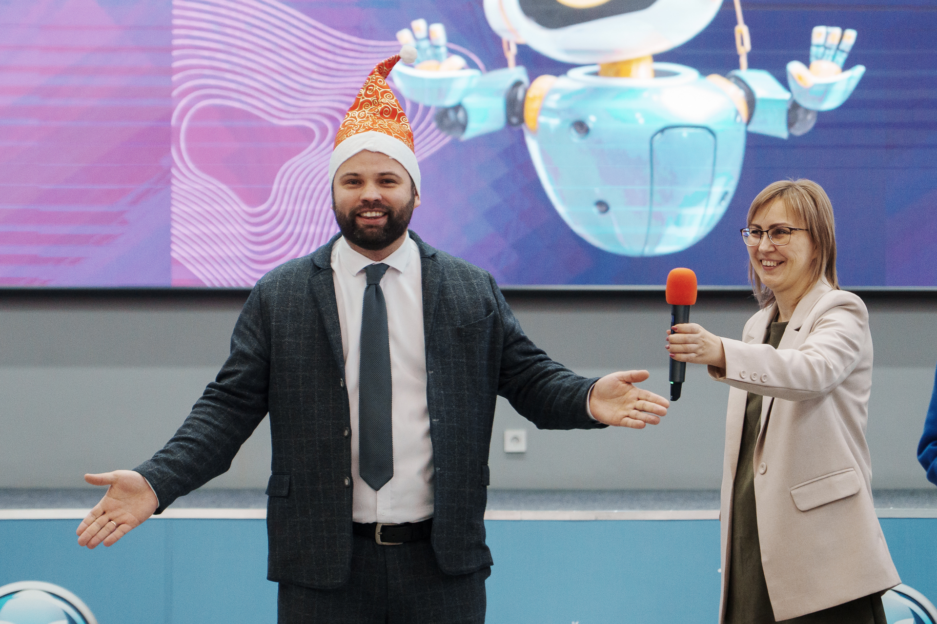 В этот раз, в преддверии Нового года, ведущими стали харизматичный Дед Мороз – декан электротехнического факультета Антон Фоминых и очаровательная Снегурочка – декан факультета строительства и архитектуры Ольга Синицына. Они обратились к аудитории: