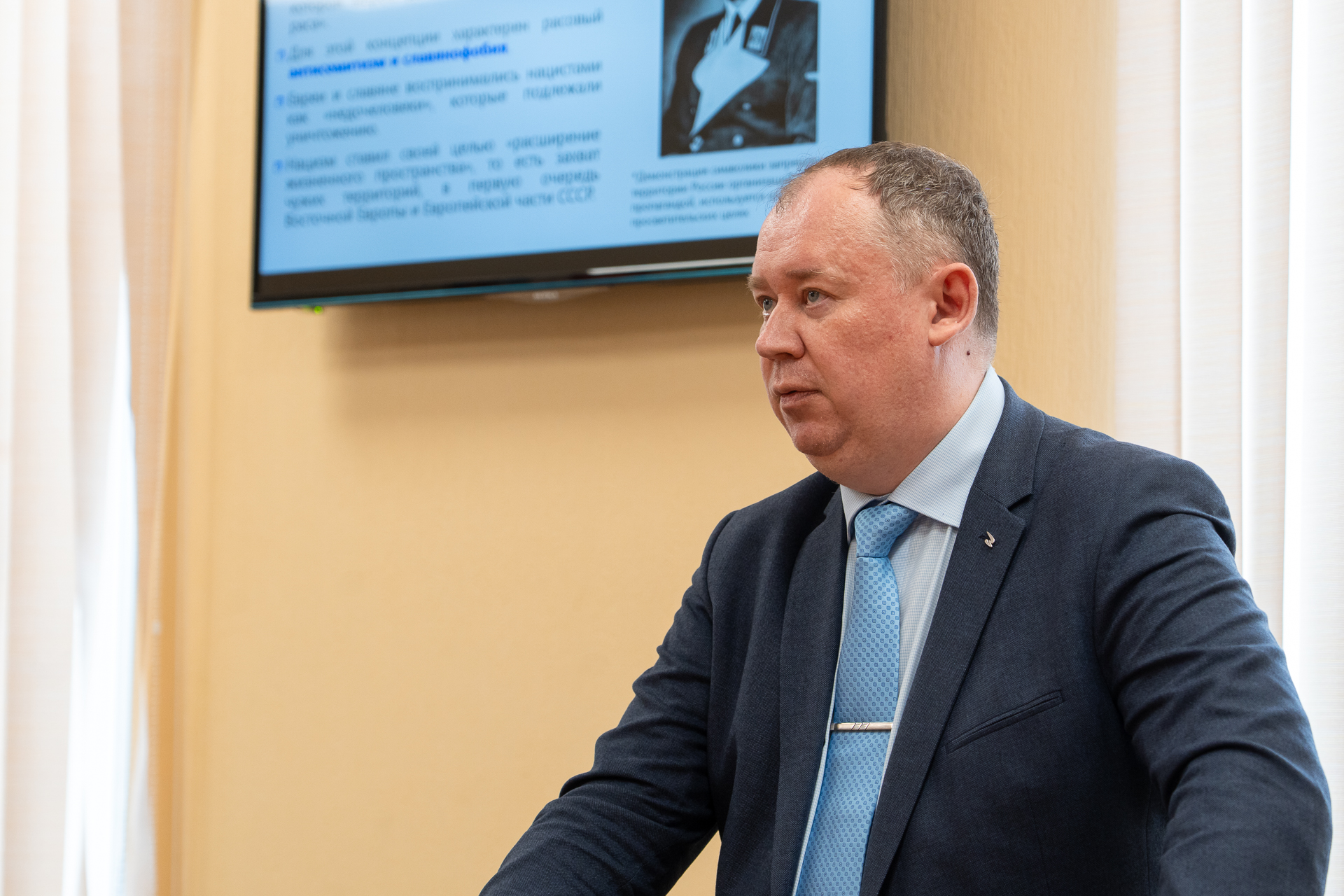 Андрей Анатольевич рассказал об идеологии национал-социализма и псевдонаучной расовой теории, одним из принципов которой был захват чужих территорий с целью расширения жилого пространства: