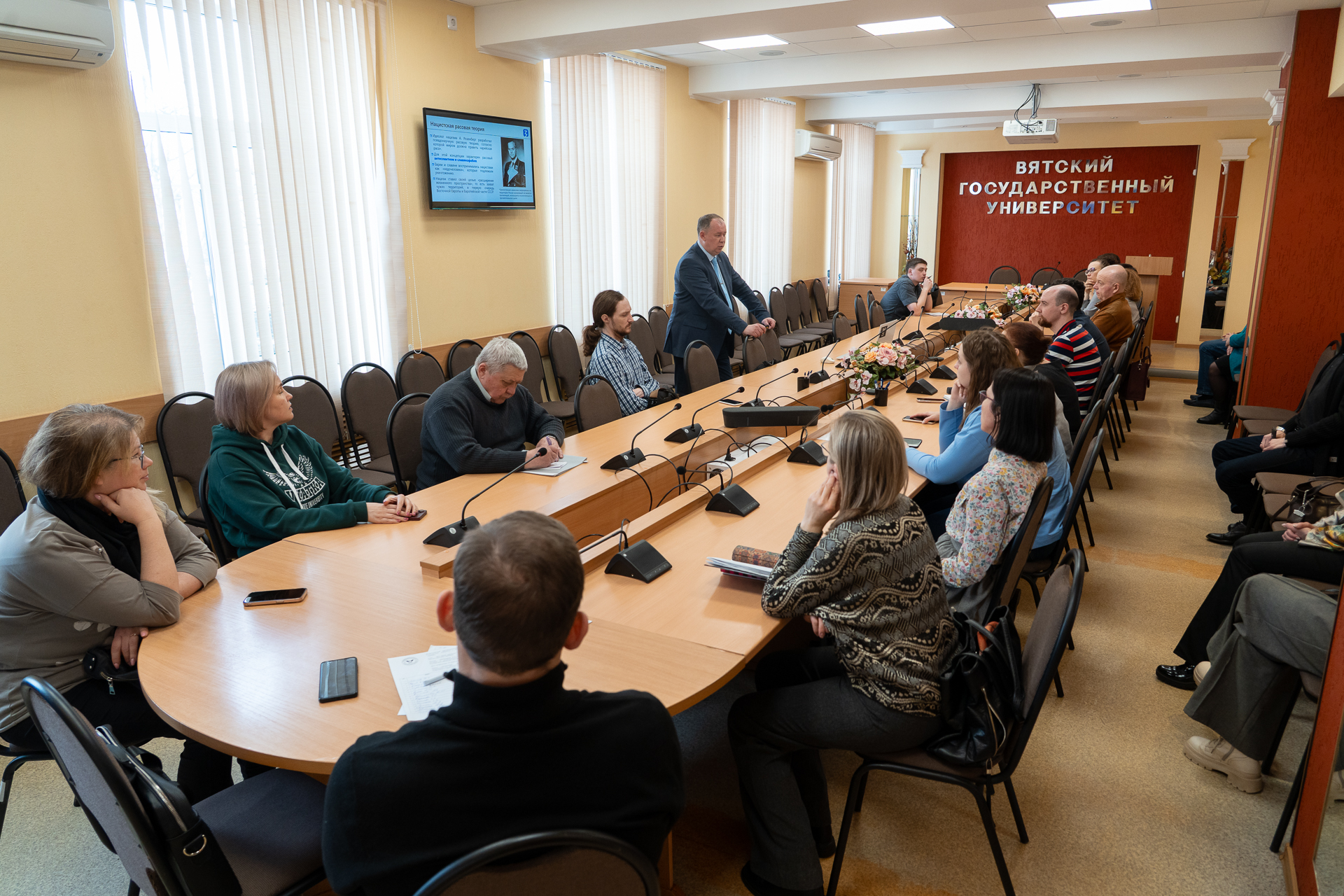 23 апреля в крупнейшем вузе Кировской области доктор исторических наук, заведующий кафедрой истории и политических наук ВятГУ Андрей Машковцев выступил перед преподавателями и сотрудниками университета с лекцией, призывающей не забывать о преступлениях нацистов против советских граждан.