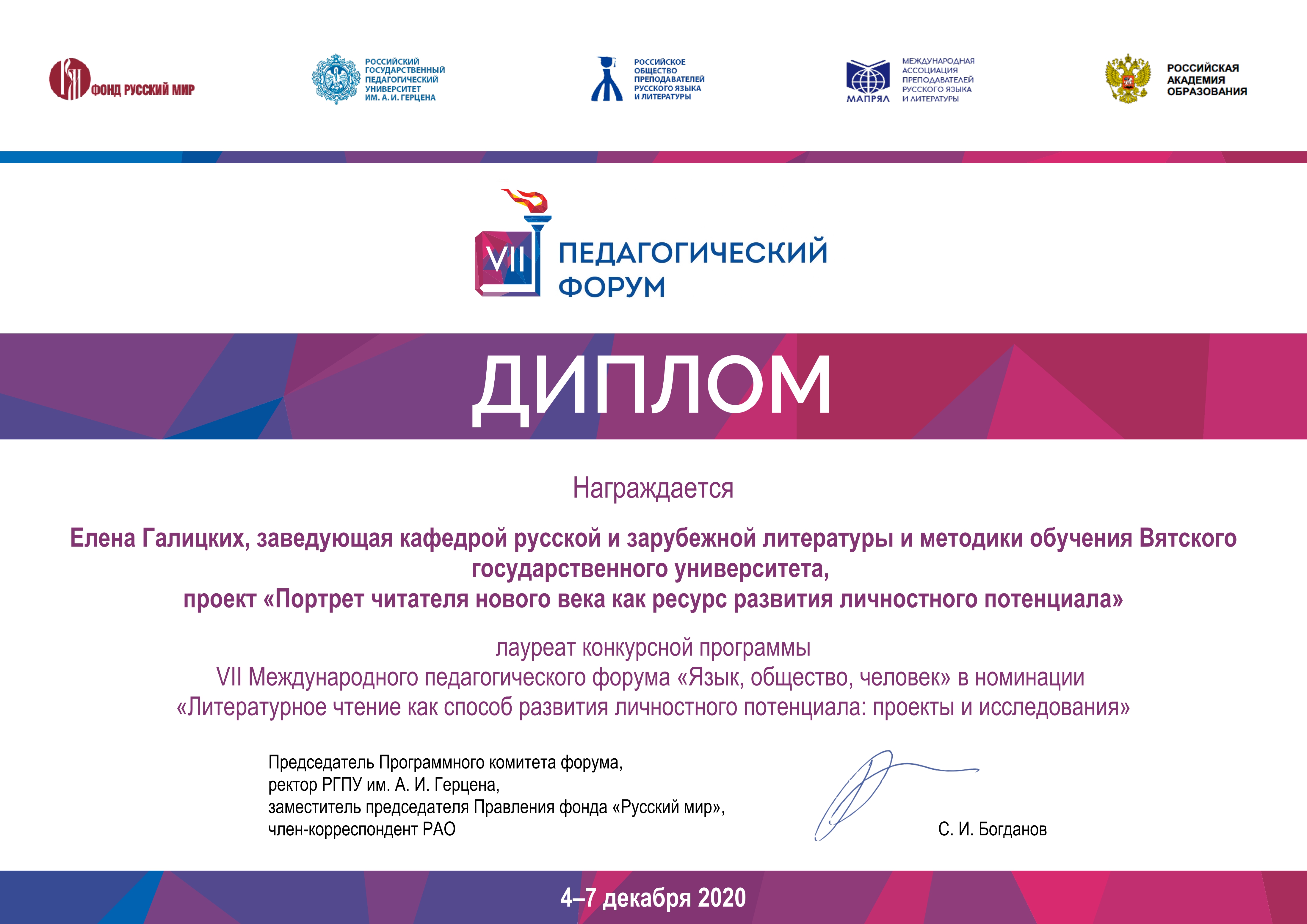 С 4 по 7 декабря проходил VII Международный педагогический форум «Язык, общество, человек», который традиционно организует фонд Русский мир, МАПРЯЛ и РГПУ им. А.И.Герцена. В этом году форум проходил дистанционно.