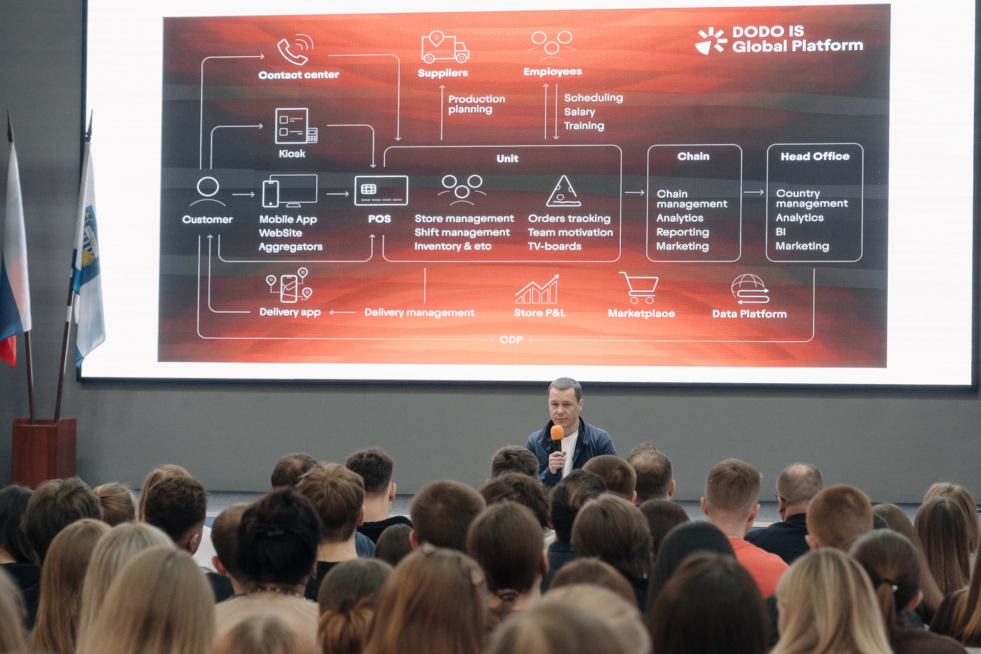 Андрей Петелин тепло поприветствовал аудиторию, признавшись, что Киров для него особенный город: здесь живут его родные. Андрей напомнил, что «Додо Пицца» начала свой путь с небольшой пиццерии в подвале одного из домов Сыктывкара, работая исключительно на доставку. Основателем проекта выступил Фёдор Овчинников – талантливый предприниматель, имеющий четкий план действий. И, что принципиально, мечту «создать глобальную компанию родом из России».
