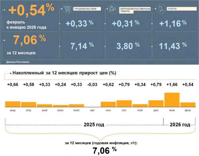 Годовая инфляция в России в феврале ожидаемо замедлилась. По данным Росстата, она составила 5,91%. Влияние разовых факторов, которые ускорили рост цен в январе, значительно уменьшилось. По прогнозу Банка России, с учетом решений по денежно-кредитной политике инфляция в 2026 году снизится до 4,5–5,5%, а в 2027 году и в дальнейшем будет находиться на цели вблизи 4%.