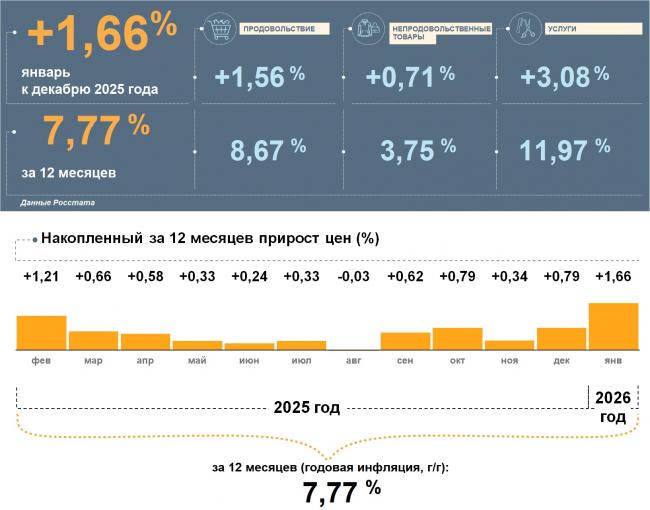 По данным Росстата, после длительного снижения годовая инфляция в России в январе 2026 года ожидаемо повысилась. Однако это не разворот тренда, а результат влияния разовых факторов. После их исчерпания инфляция вновь замедлится. По прогнозу Банка России, в 2026 году она снизится до 4,5–5,5%, а в 2027 году и в дальнейшем будет находиться на цели вблизи 4%.