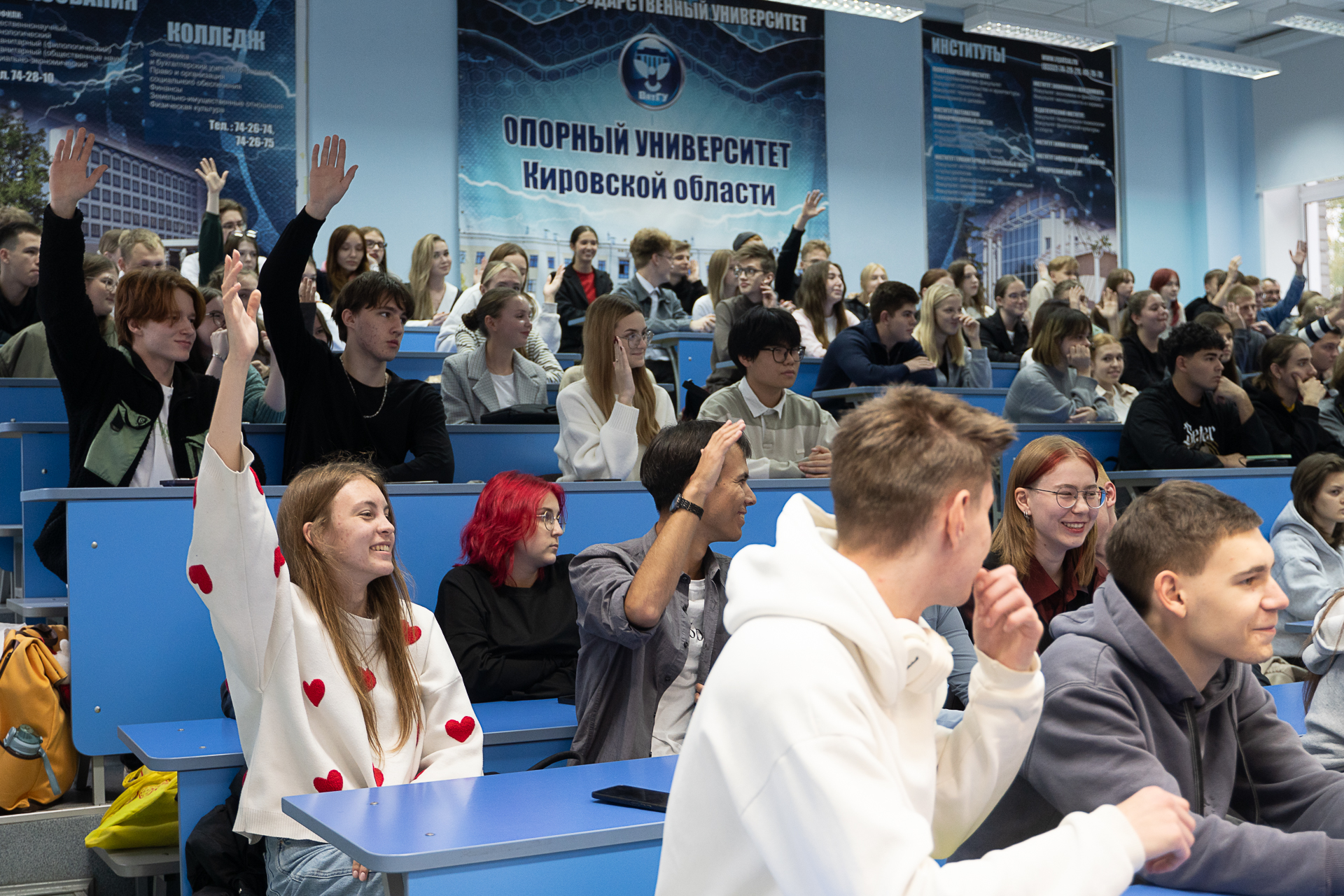 Валентин Николаевич поинтересовался у вчерашних абитуриентов, по каким причинам они решили поступить в Вятский государственный университет и остаться в родном городе.