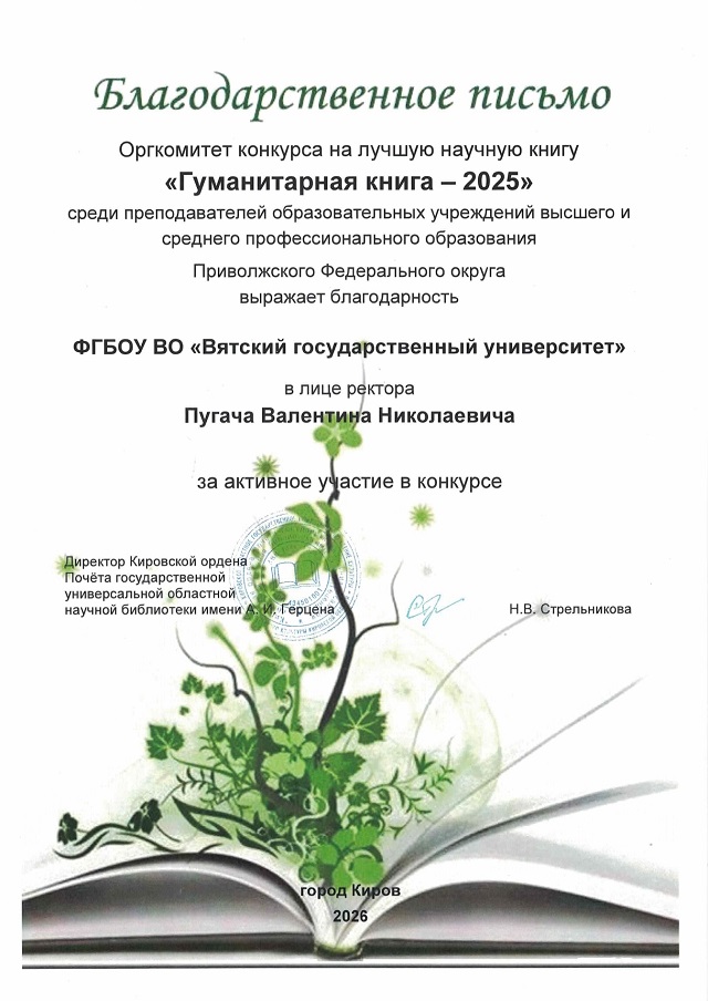 Оргкомитет конкурса «Гуманитарная книга – 2025» выразил благодарность крупнейшему вузу Кировской области в лице ректора Валентина Пугача.