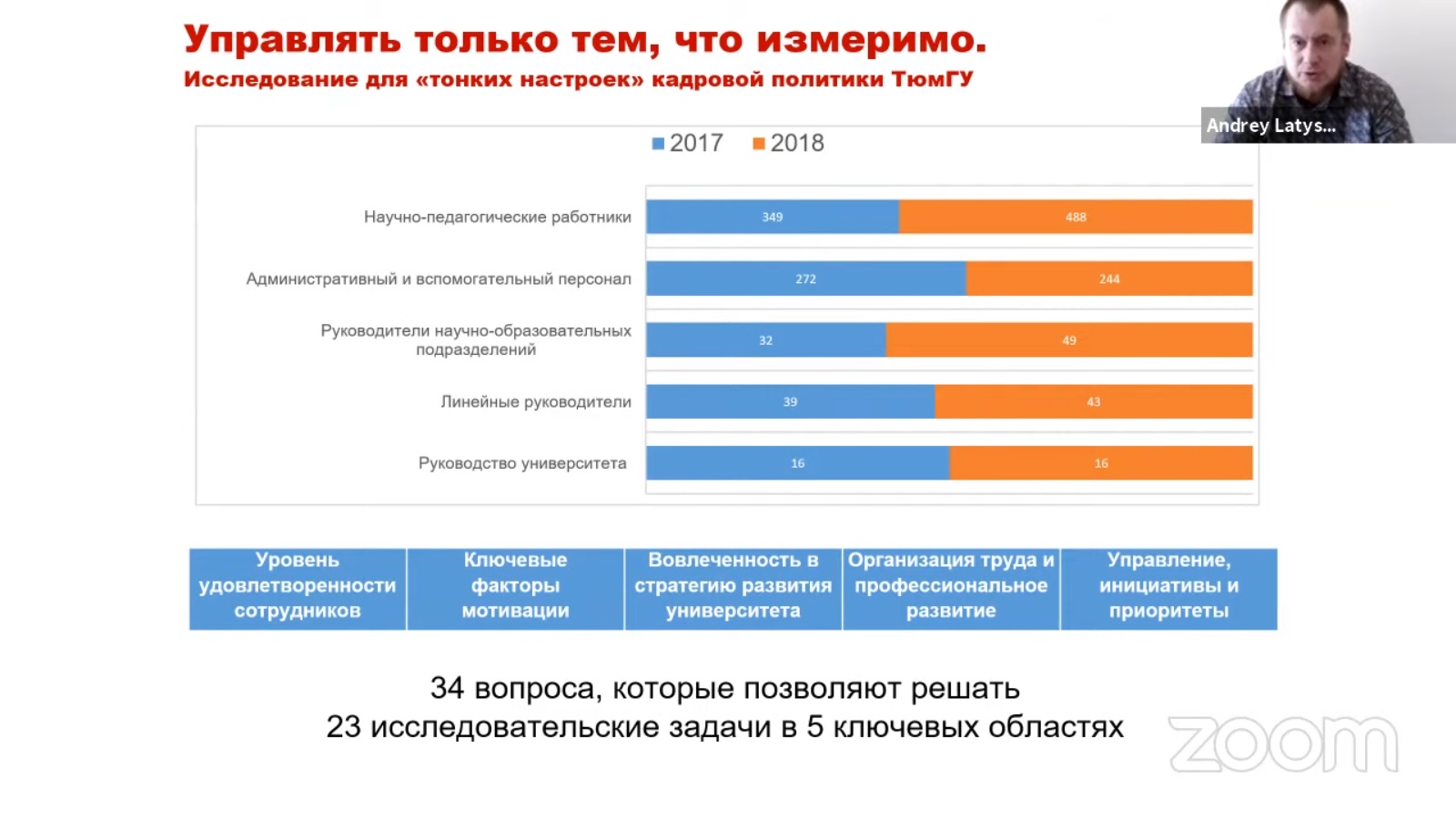 Андрей Латышев, проректор ТюмГУ, остановился на управлении проектами как инструменте стратегии развития человеческого капитала в университете, используя в качестве примера вузовский проект «Школа академического превосходства».