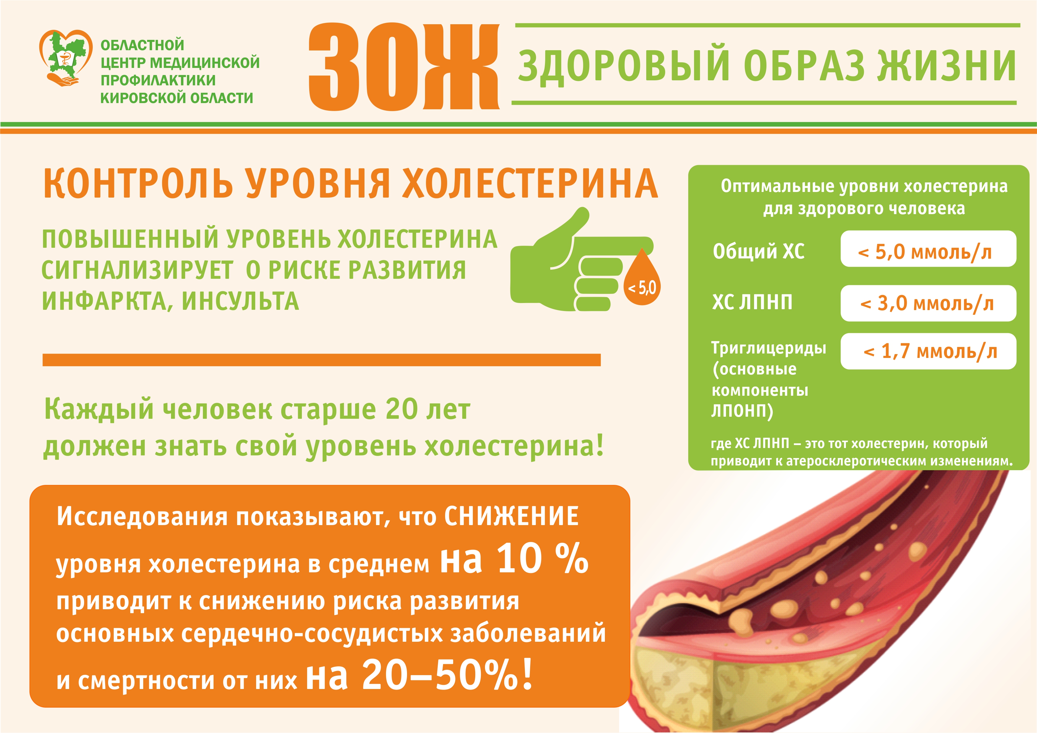 Нормальные показатели холестерина крови Вы найдете на сайте КОГБУЗ "Медицинский информационно-аналитический центр, центр общественного здоровья и медицинской профилактики" в разделе «Повышенный уровень холестерина крови».