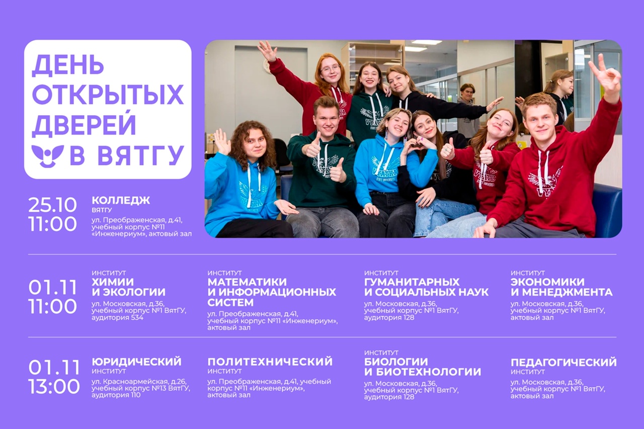 25 октября свои двери распахнет колледж ВятГУ, а 1 ноября ждем вас на знакомство с институтами вуза.