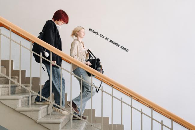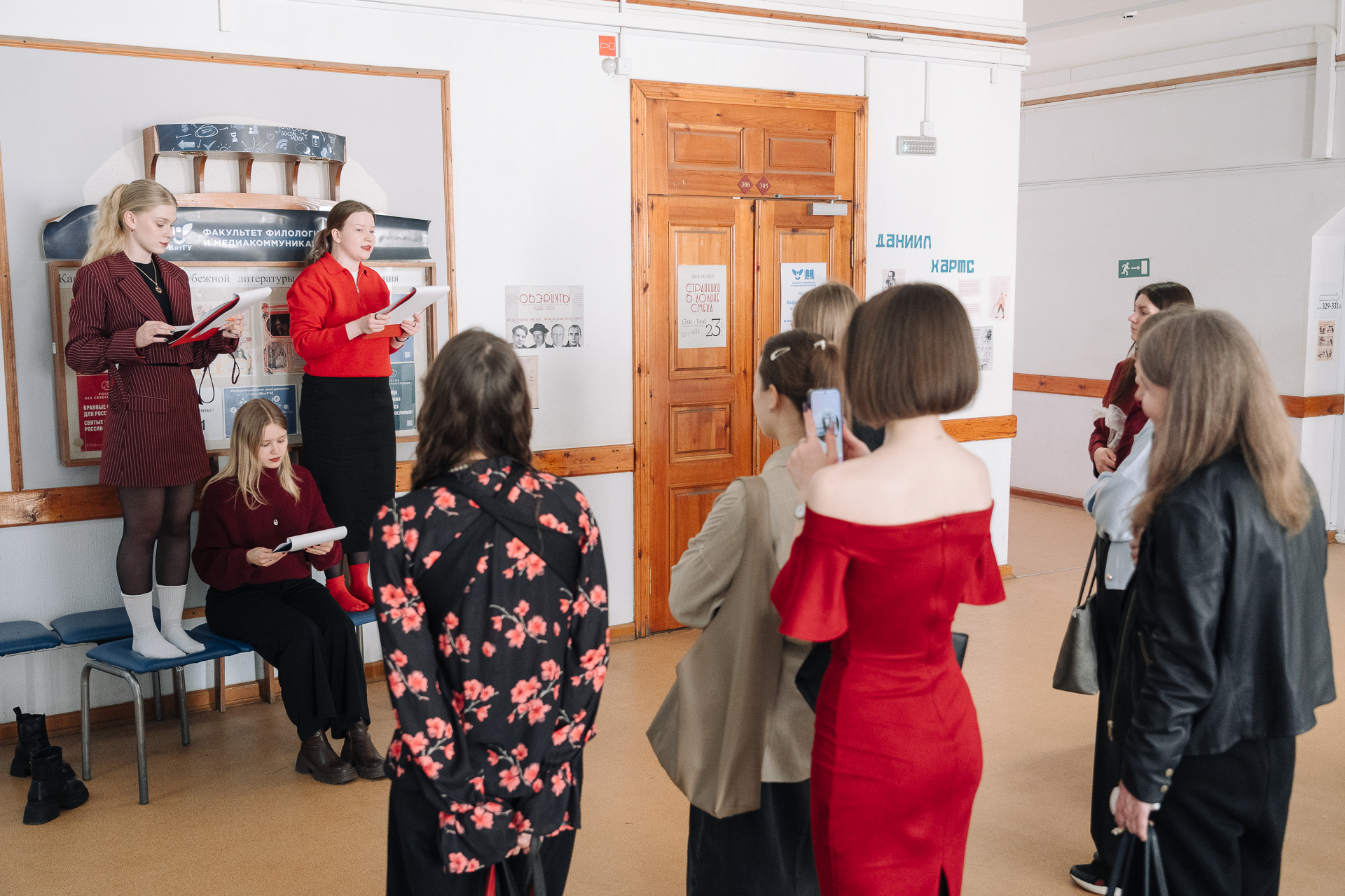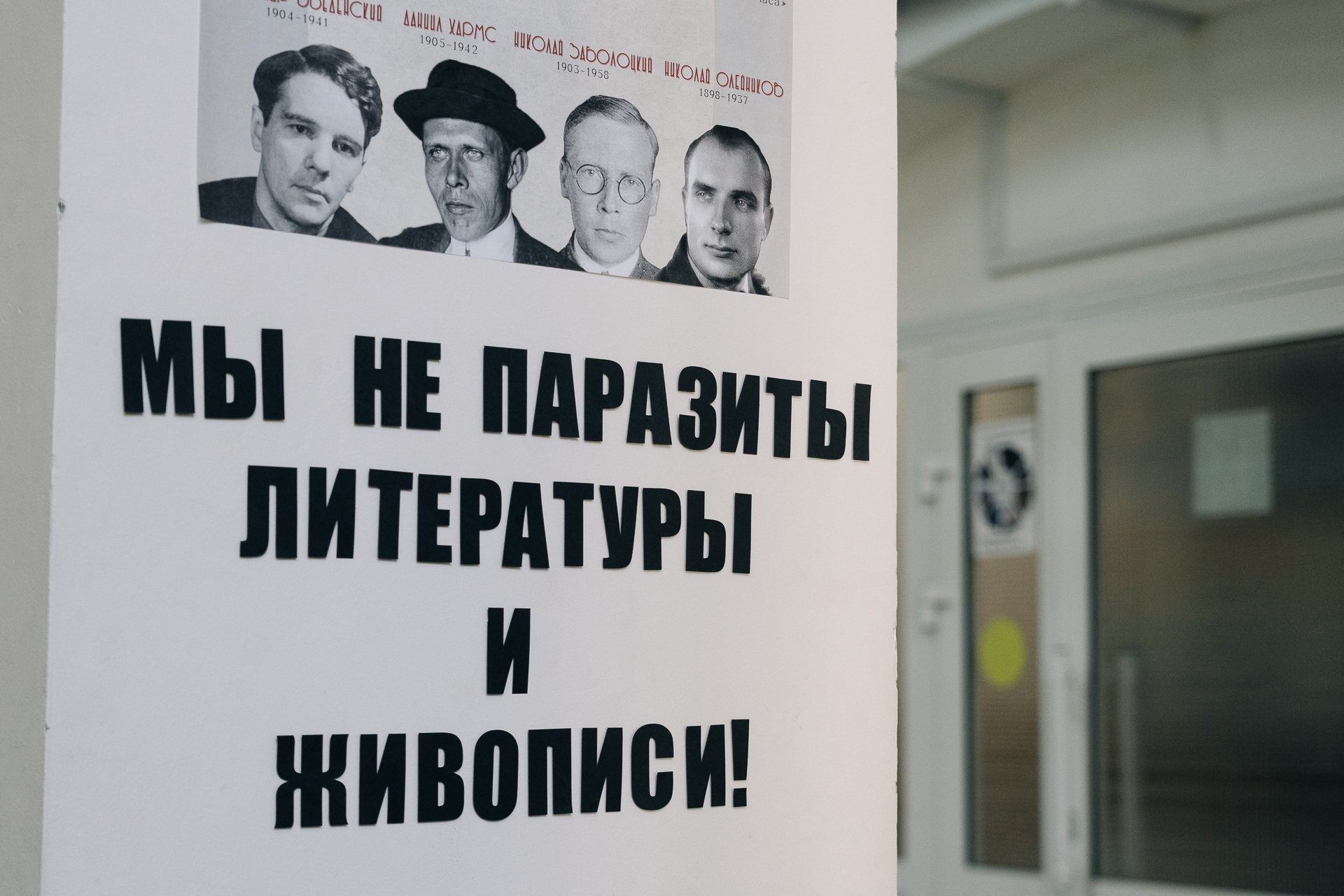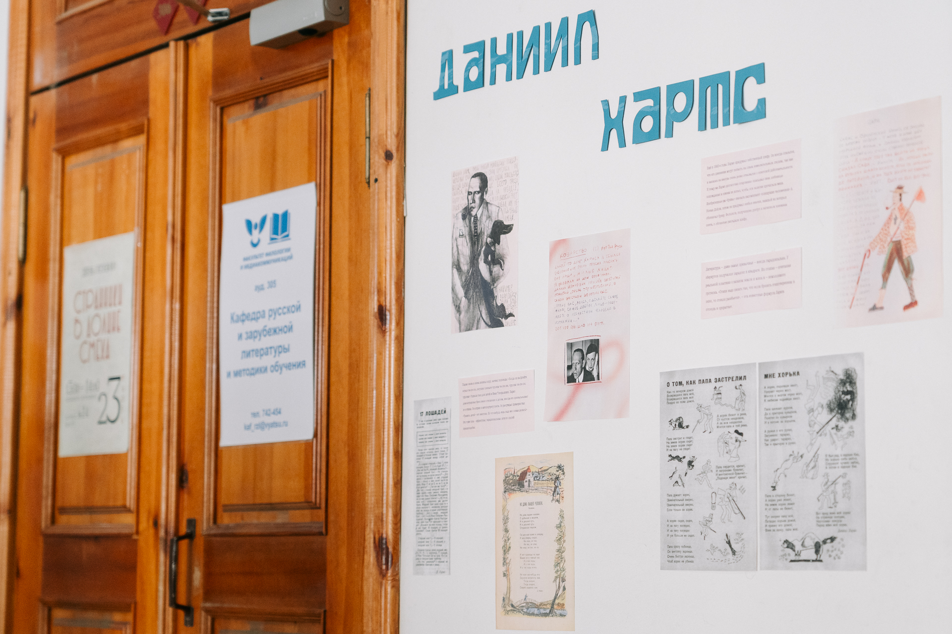 Студентки оригинально оформили пространство корпуса, создав увлекательную экспозицию, повествующую о жизни и творчестве поэтов-обэриутов Александра Введенского, Николая Олейникова, Даниила Хармса, Николая Заболоцкого.