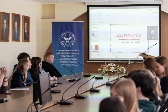 24 февраля площадку Координационного центра по вопросам формирования у молодежи активной гражданской позиции, предупреждения межнациональных и межконфессиональных конфликтов, противодействия идеологии терроризма и профилактики экстремизма ВятГУ посетили специалисты медиаотдела и отдела реализации патриотических и профилактических программ Областного дворца молодежи.