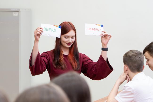 16 апреля восьмиклассники средней школы №14 г. Кирова собрались на классный час «Ты в хорошей компании», подготовленный студентами колледжа ВятГУ – амбассадорами федерального проекта «Профессионалитет».