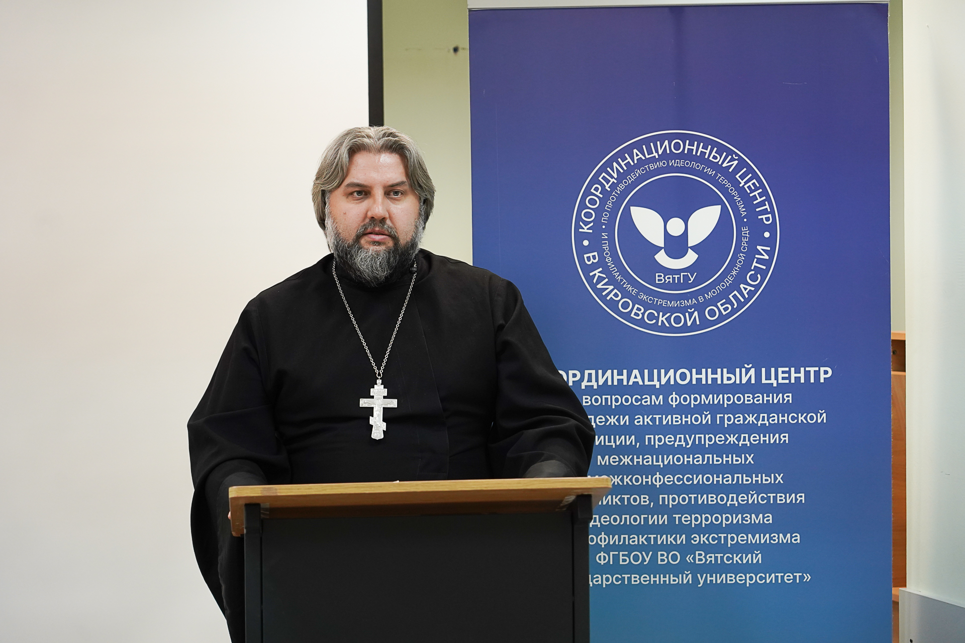 Приглашенный спикер, Иерей Роман Конев, штатный клирик храма в честь вмч. и целителя Пантелеймона г. Кирова, помощник руководителя Миссионерского отдела Вятской епархии по апологетике и антисектанской деятельности, обратил внимание студентов на важность традиционных ценностей.