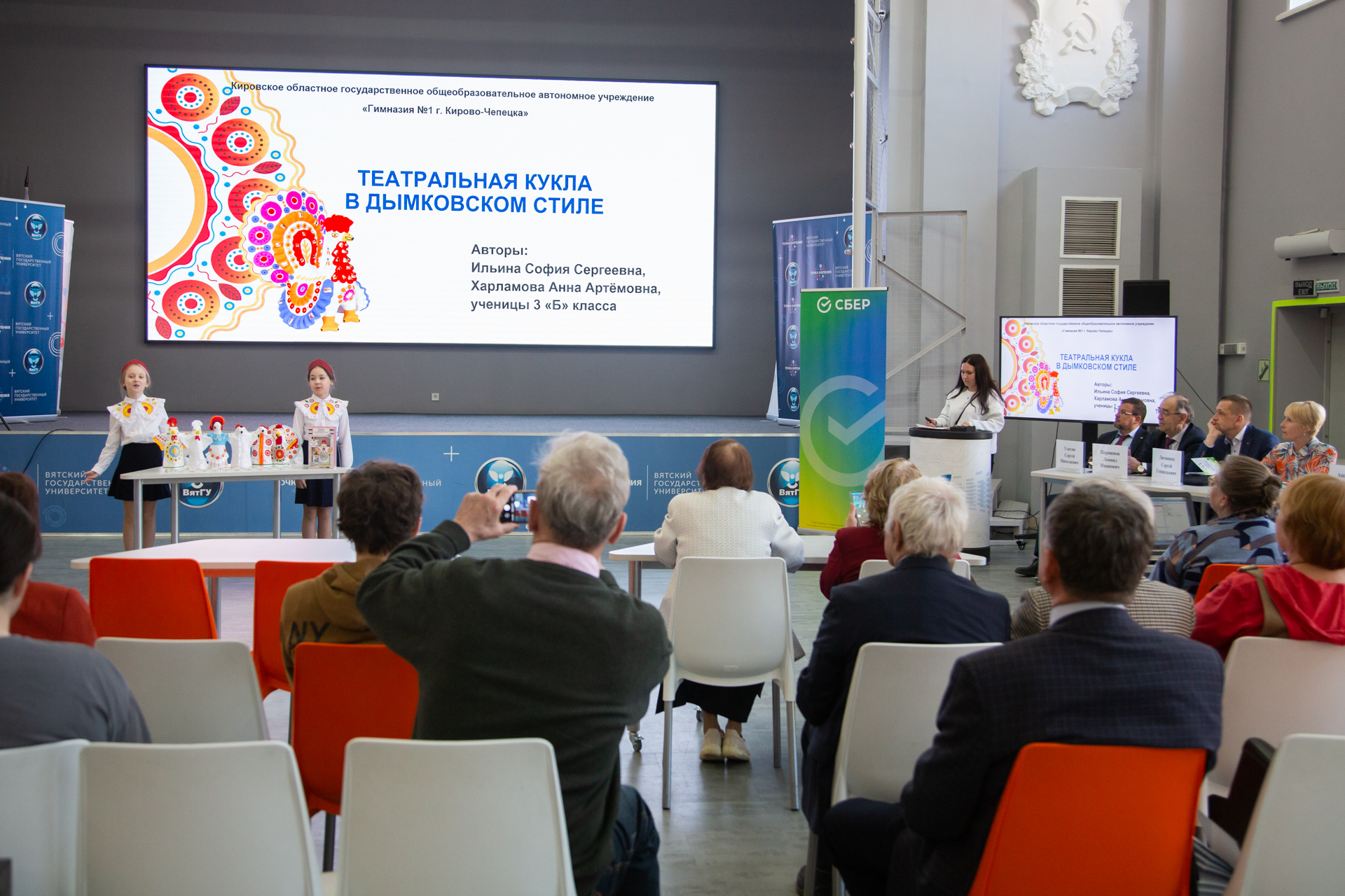Одним из таких мероприятий явился молодежный конкурс «Мой любимый город», начавшийся за несколько часов до официального старта конференции. Участники конкурса, посвященного юбилею города Кирова, представили свои научно-исследовательские, проектные и творческие работы. Третьеклассницы гимназии №1 города Кирово-Чепецка Анна Харламова и София Ильина покорили конкурсное жюри презентацией собственного проекта «Театральная игрушка в дымковском стиле». Школьницам тут же поступило предложение от организаторов выступить на церемонии открытия основного события.