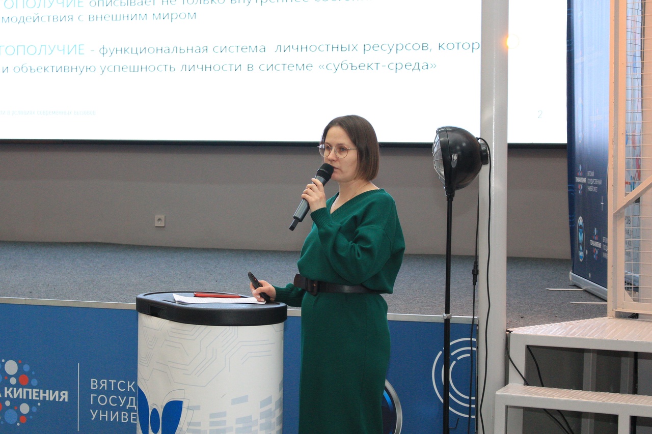 Модераторы пленарного заседания – Галина Симонова, доктор педагогических наук и доцент кафедры психологии ВятГУ, директор «Центра социально-психологической помощи» Нина Ершова представили первого докладчика – Анастасию Горбушину, доцента кафедры психологии Педагогического института Вятского госуниверситета, кандидата психологических наук, которая сообщила о результатах научных разработок по проблеме достижения психологического благополучия студентов, изучаемых в рамках проекта «Гармоничная личность» программы «Приоритет 2030». В этот раз Анастасия Владимировна сфокусировалась на измерении субъективного благополучия студентов в университете.