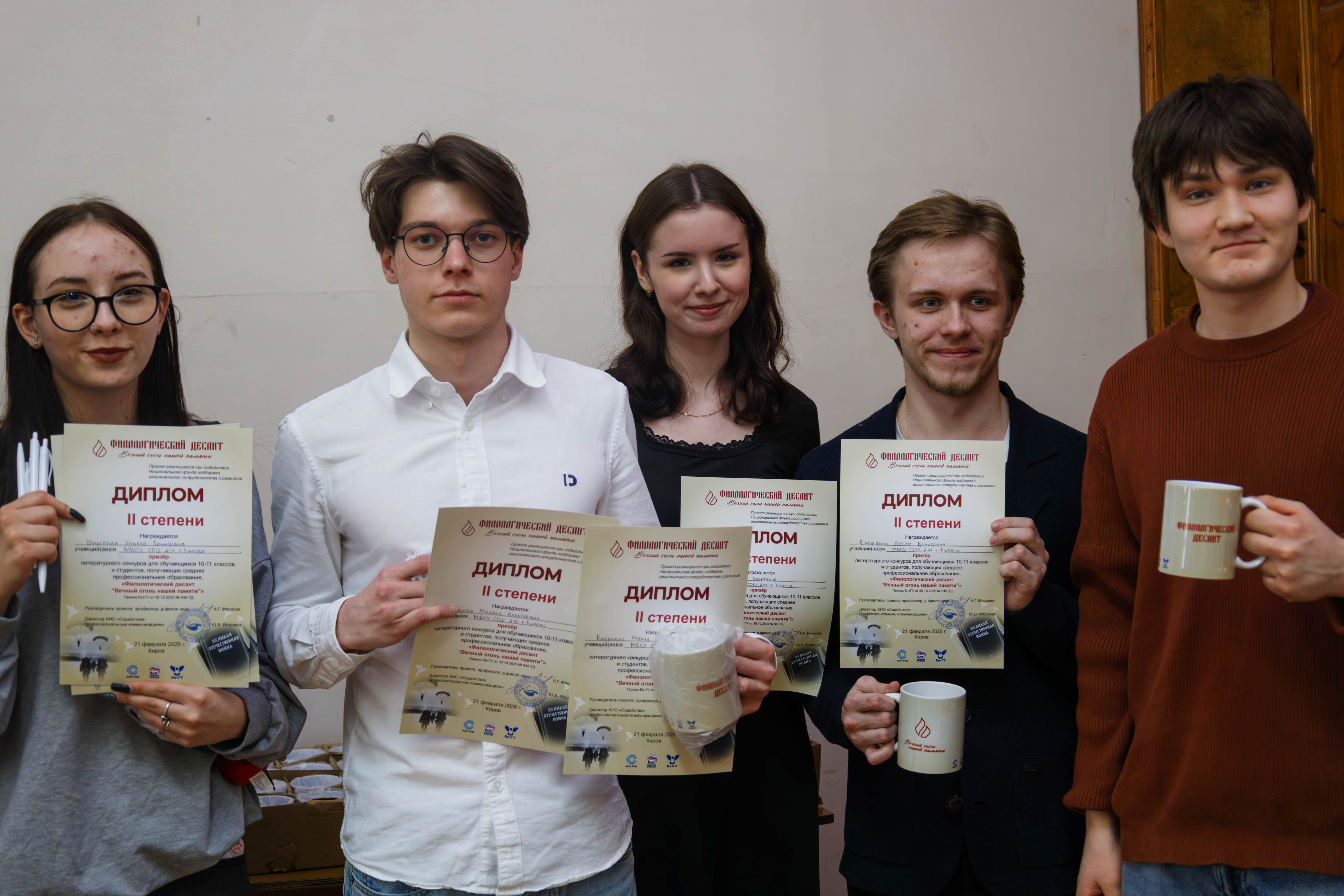 Дипломами I степени награждены обучающиеся 11 А класса МБОУ СОШ № 4 г. Кирова Анна Журавлева, Иван Игошин, Елизавета Краева, Евгений Митин, Олег Пыхтеев и Кирилл Сметанин.