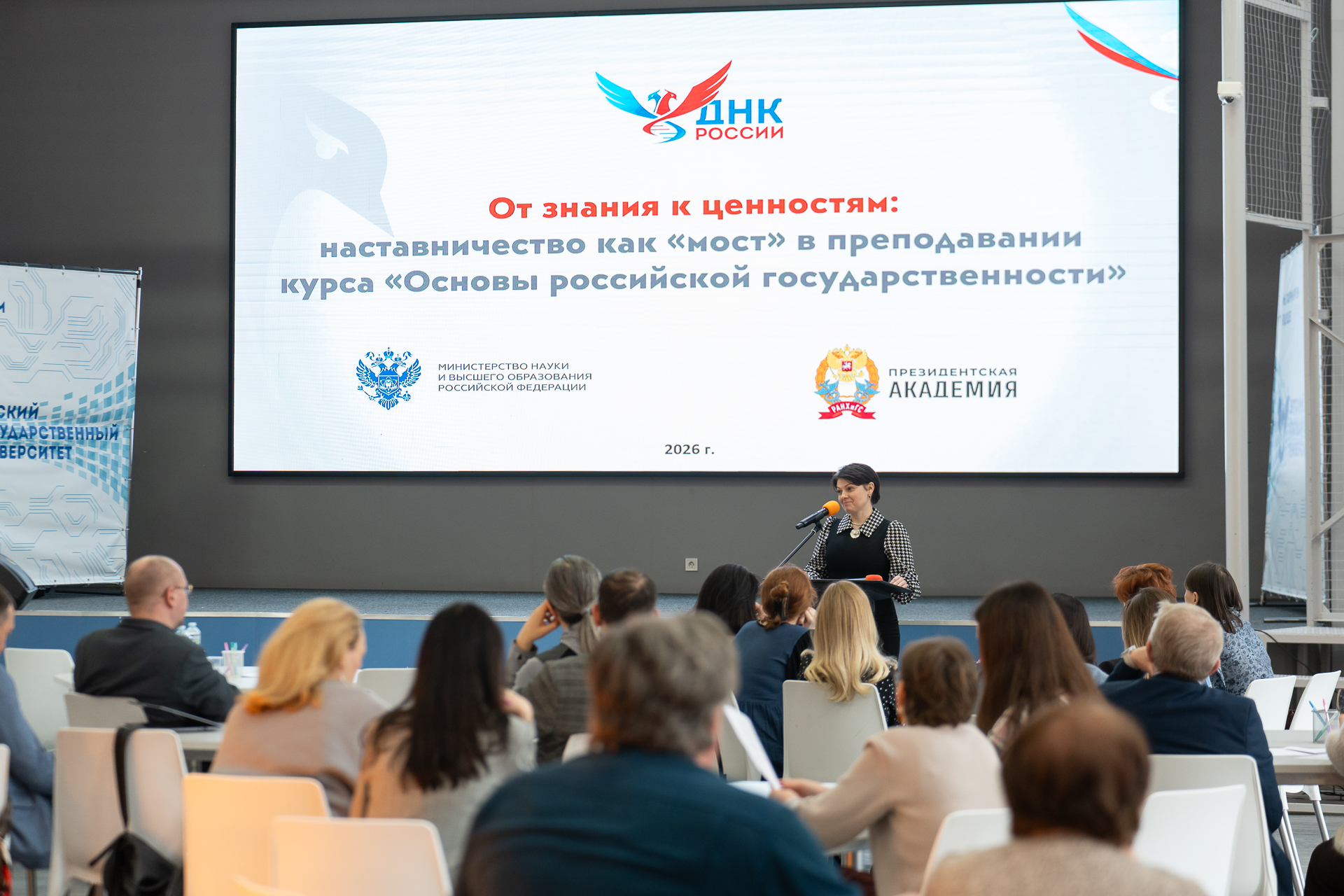 «От знания к ценностям: наставничество как «мост» в преподавании курса «Основы российской государственности» - такой явилась тема выступления Анастасии Сусловой, заместителя начальника Управления сетевых и партнерских проектов государственной политики РАНХиГС.
