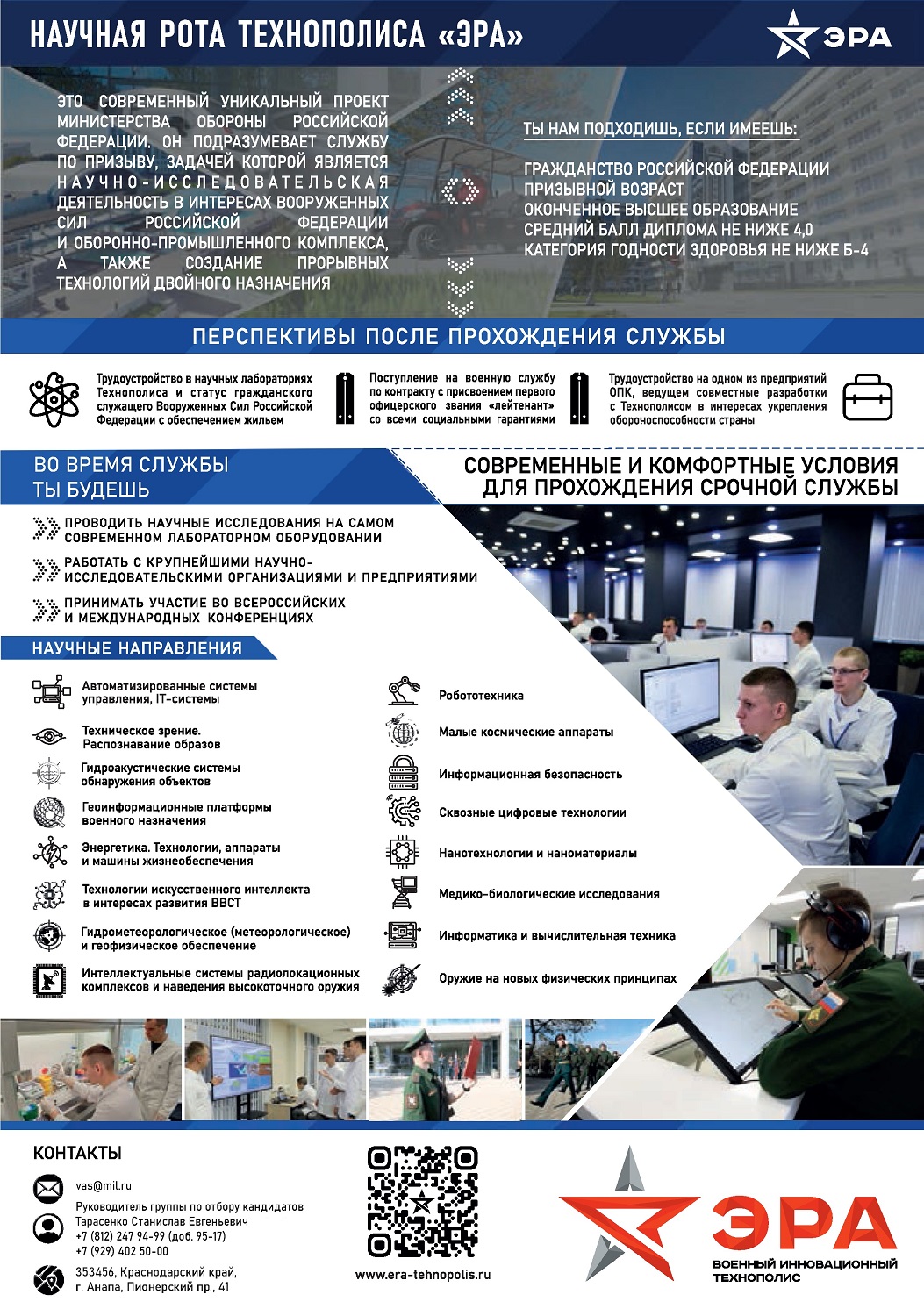В научные роты ВИТ «ЭРА» также могут рассматриваться кандидаты, имеющие выдающиеся достижения в научно-исследовательской и изобретательской деятельности российского и (или) международного уровня в научно-технической сфере, включенные в установленном порядке в базу данных молодежи с высокими интеллектуальными способностями ВИТ «ЭРА».