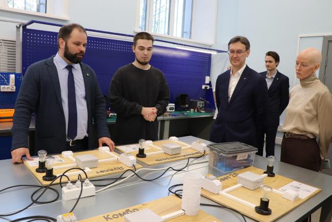 Декан электротехнического факультета ВятГУ Антон Фоминых показал гостям – заместителю генерального директора «Т Плюс» по управлению персоналом и организационному развитию Ольге Вайнер и руководителям Кировского филиала – действующую лабораторию мехатроники беспилотных летательных аппаратов. Здесь любят заниматься не только студенты, но и учащиеся инженерных классов школ Кировской области – это ещё один проект, реализуемый опорным вузом совместно с «Т Плюс».