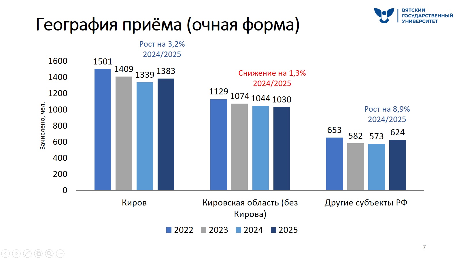 География приема в ВятГУ в текущем году значительно увеличилась за счет количества поступающих из других субъектов Российской Федерации, что говорит о высоком качестве подготовки в Вятском государственном университете.
