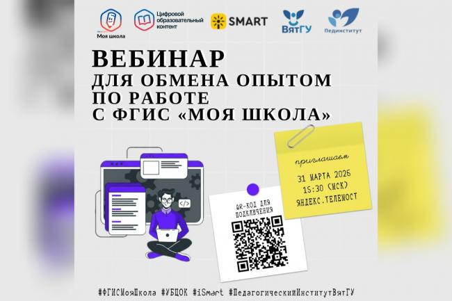 31 марта Педагогический институт ВятГУ проведет для школ региона вебинар по работе с универсальной библиотекой цифрового образовательного контента (УБ ЦОК, ФГИС «Моя школа»). Слушатели вебинара познакомятся с опытом учителей из школ Кировской области, где им расскажут о работе с верифицированным контентом цифровых образовательных ресурсов iSmart в учебной деятельности