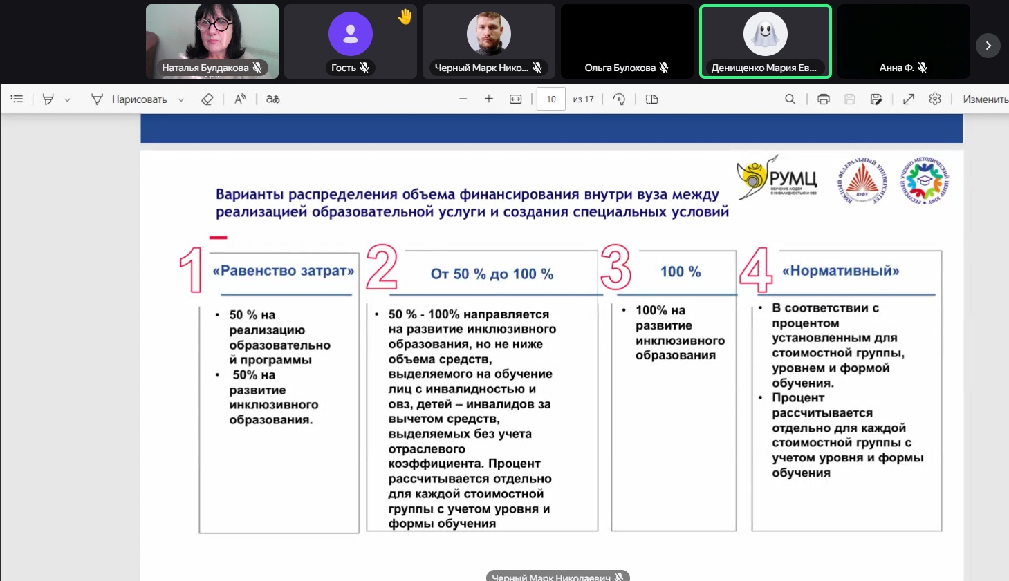 В ходе мероприятия более 240 представителей управленческих структур, экономистов преподавателей вузов Российской Федерации, занимающихся проблемами инклюзивного образования, активно обсуждали вопросы нормативно-правовой базы финансового обеспечения инклюзивного образования; распределения объема финансирования внутри вуза; механизмы стимулирования сотрудников вузов, работающих с обучающимися с инвалидностью и ограниченными возможностями здоровья.