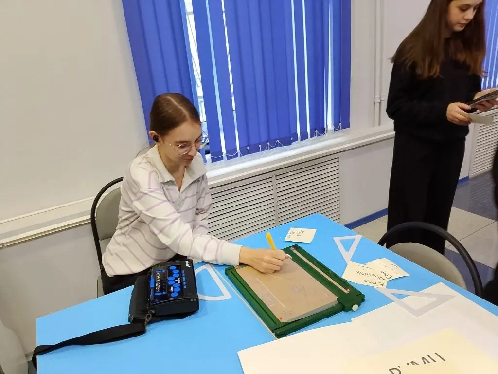 Ольга Александровна продемонстрировала процесс печати рельефным шрифтом Брайля. Школьники также попробовали самостоятельно создать рельефный рисунок с помощью устройства PIAF (Picture in a Flash).